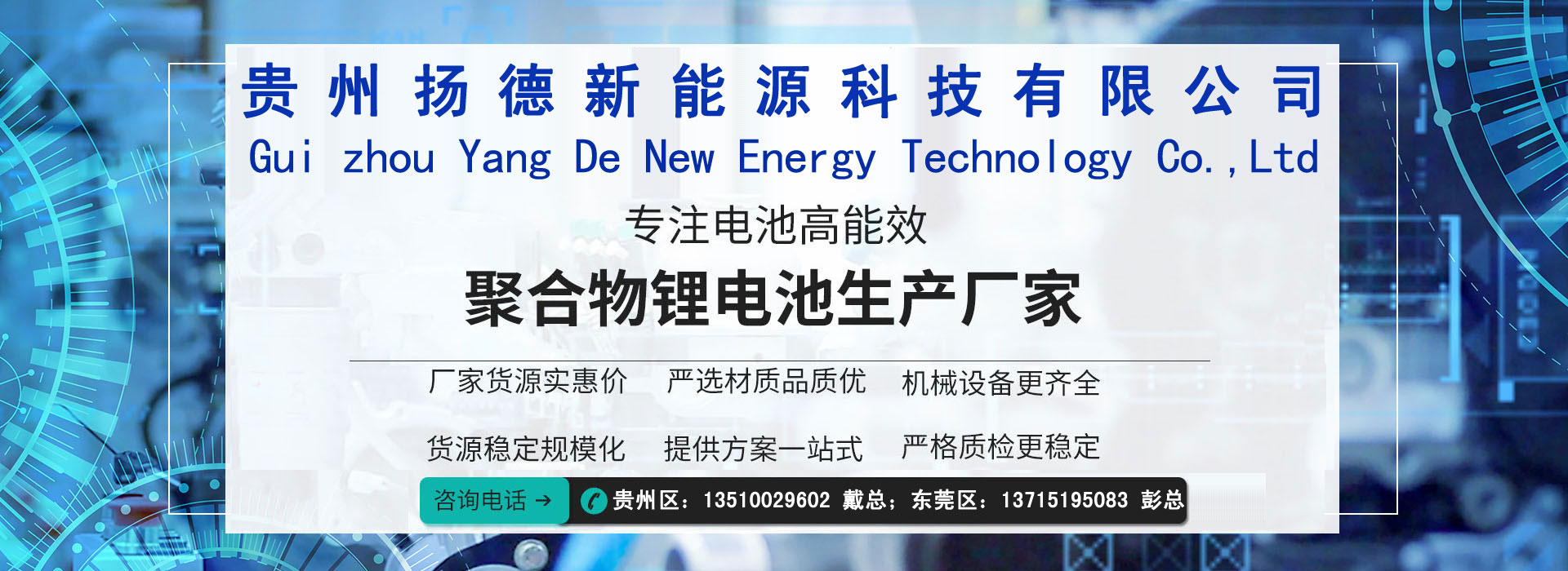 貴州揚(yáng)德新能源科技有限公司擁有廠(chǎng)房面積10000多平米,是一家以研發(fā)、生產(chǎn)制造鋰離子電池、電池管理系統(tǒng)(BMS)的專(zhuān)業(yè)鋰電池電源生產(chǎn)廠(chǎng)家。公司擁有一批鋰離子電池組,BMS研發(fā)、生產(chǎn)的專(zhuān)業(yè)技術(shù)人員,公司技術(shù)力量雄厚,產(chǎn)品研發(fā)和生產(chǎn)能力強(qiáng)。揚(yáng)德能源具備強(qiáng)大的技術(shù)后盾,與貴州大學(xué)、國(guó)防科技大學(xué)和中國(guó)電子科技集團(tuán)建立了良好的合作關(guān)系。揚(yáng)德能源在鋰電池PACK領(lǐng)域具備國(guó)內(nèi)先進(jìn)水平,已獲得多項(xiàng)發(fā)明和實(shí)用新型專(zhuān)利,在國(guó)家一些重大項(xiàng)目中承擔(dān)特種鋰離子電池和特殊用途后備電源的研發(fā)生產(chǎn)任務(wù)。為國(guó)內(nèi)外眾多的不同客戶(hù)提供了很多個(gè)性化設(shè)計(jì)和產(chǎn)品制造。